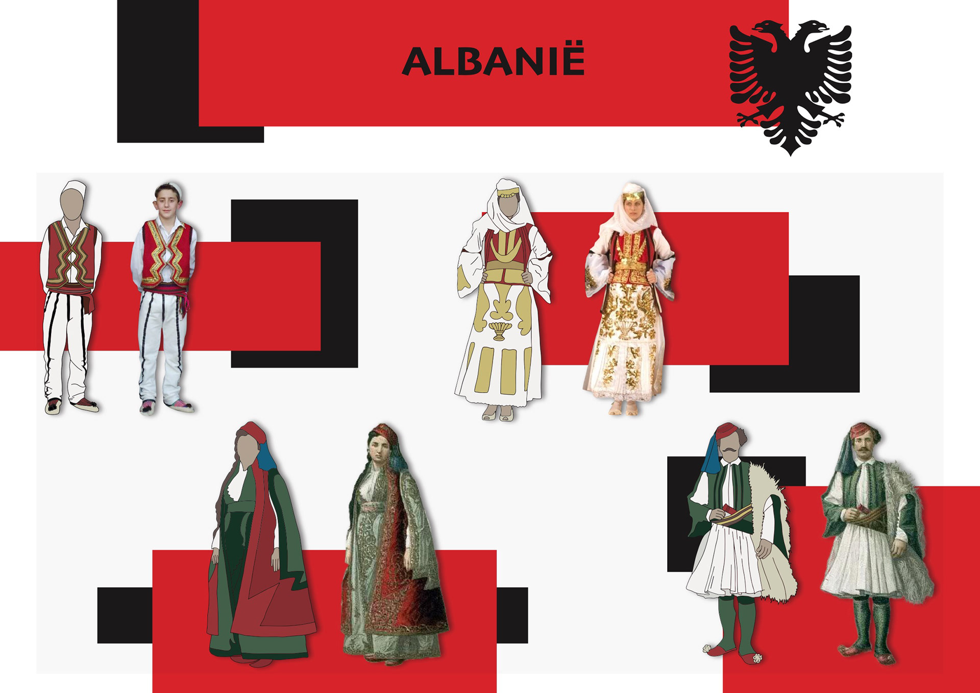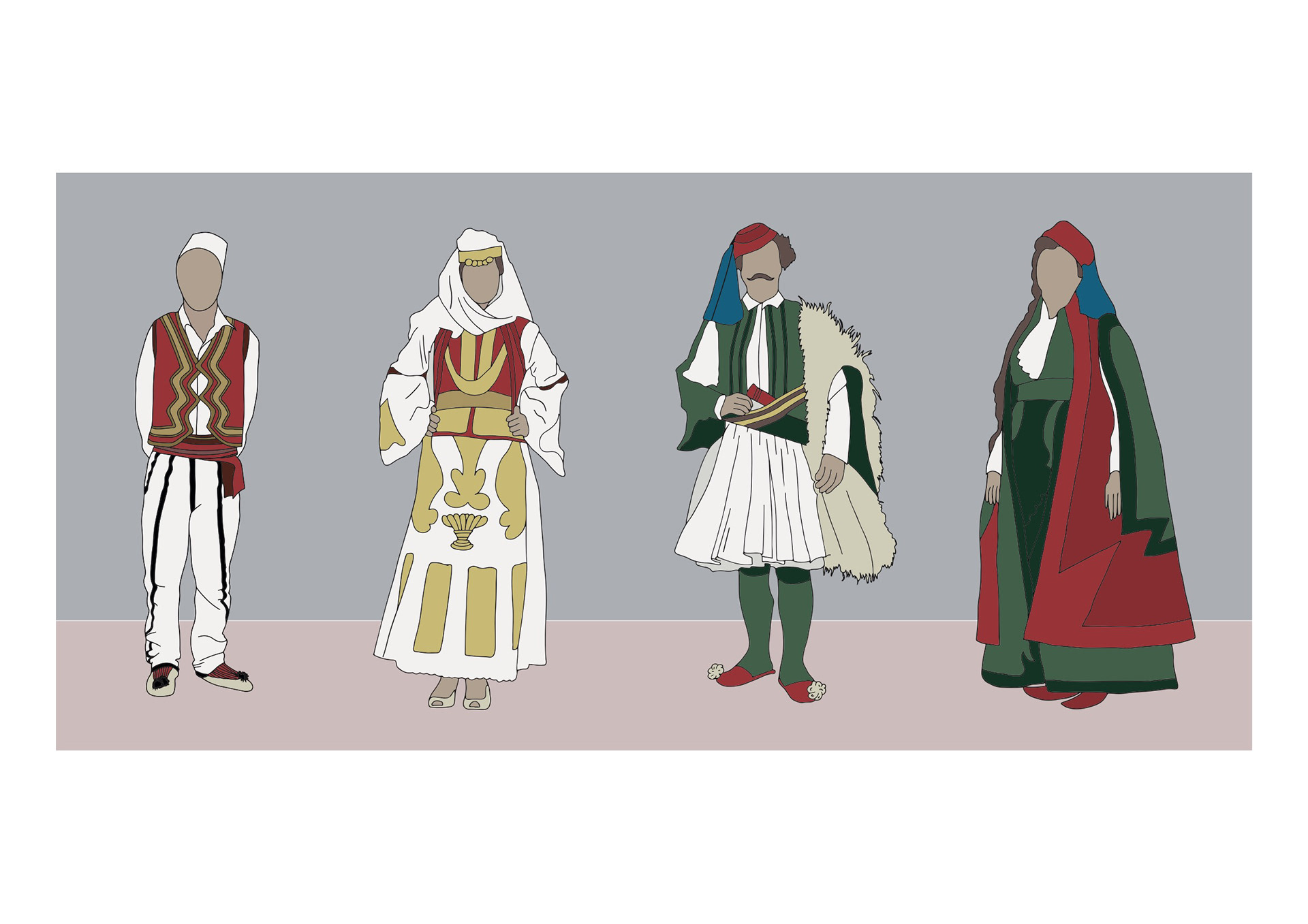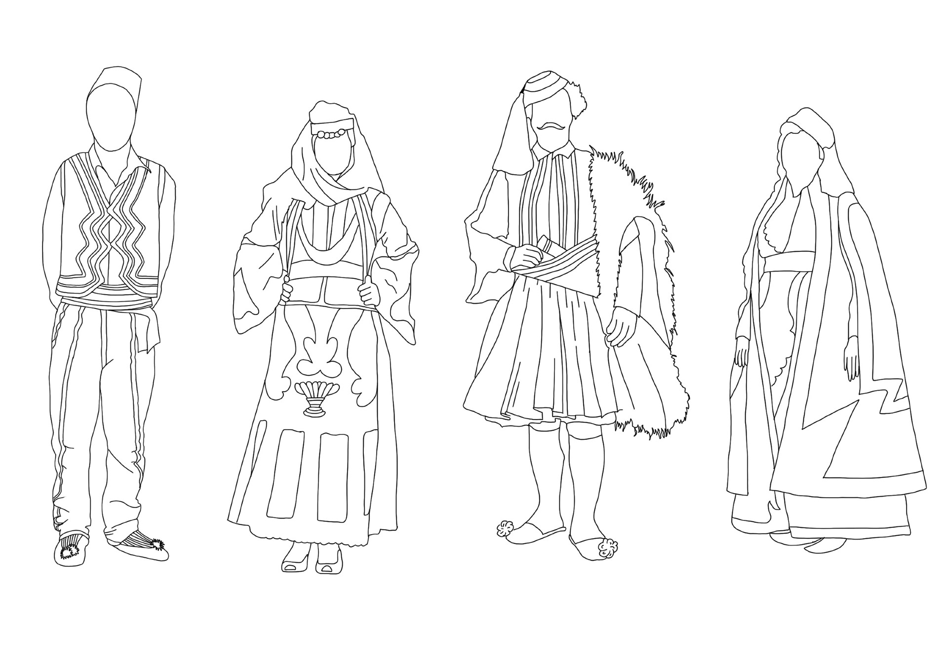 Zoek vier afbeeldingen met aantrekkelijke klederdracht van een cultuur. Vereenvoudig de afbeeldingen tot een grafisch werk.