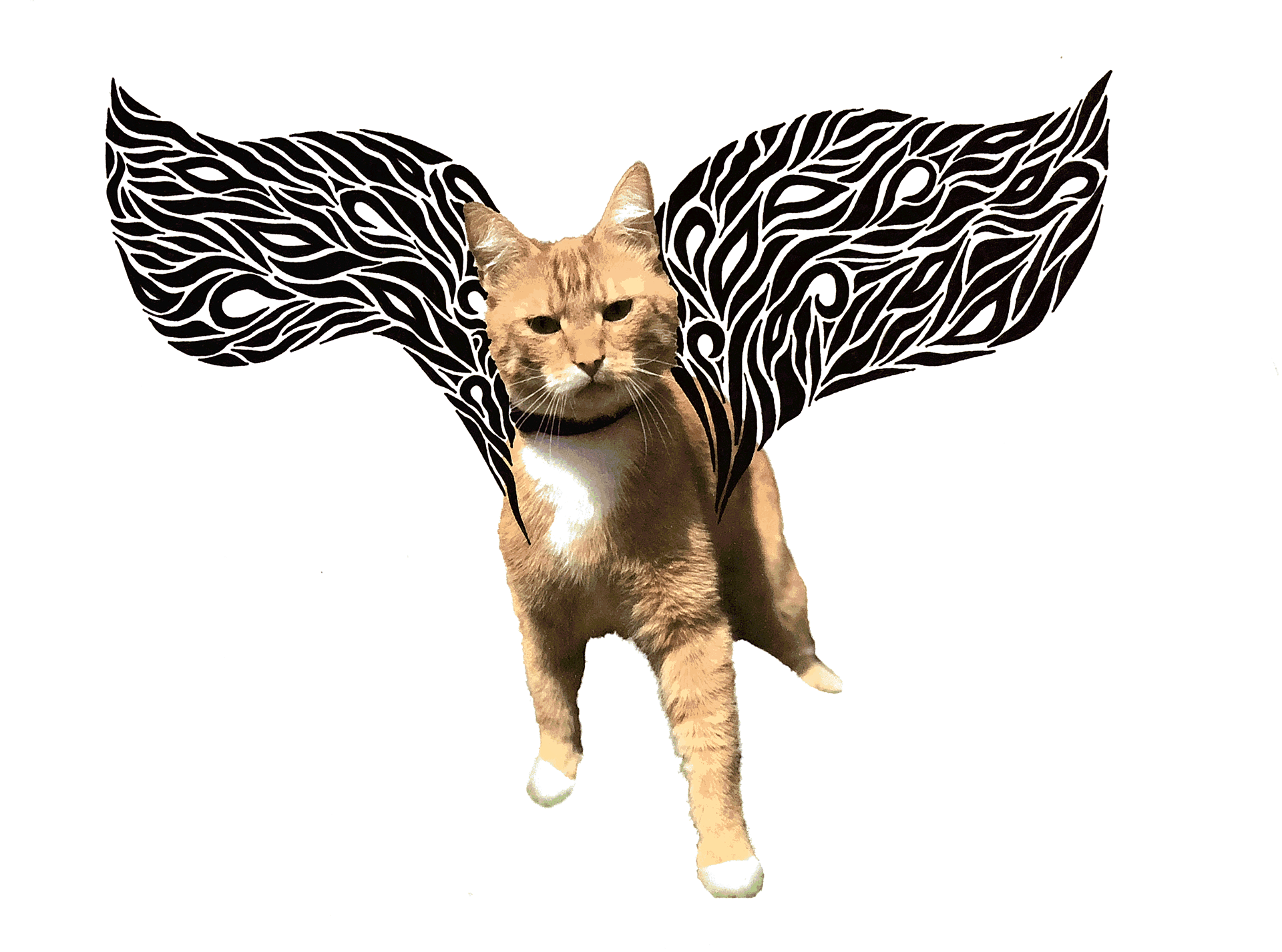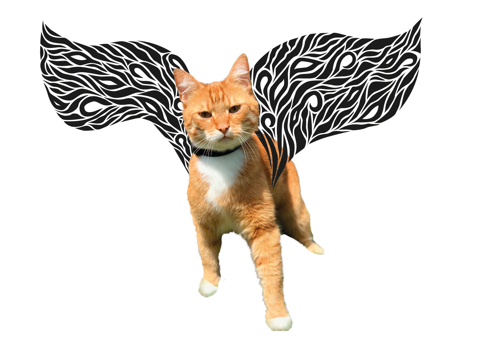 Zoek naar een afbeelding van een viervoeter. Ontwerp een stel vleugels door middel van vloeiende en/of hoekige lijken of vlakken die tussen dik en dun evolueren. Zet de vleugels op het dier bij de digitalisering van het ontwerp.
