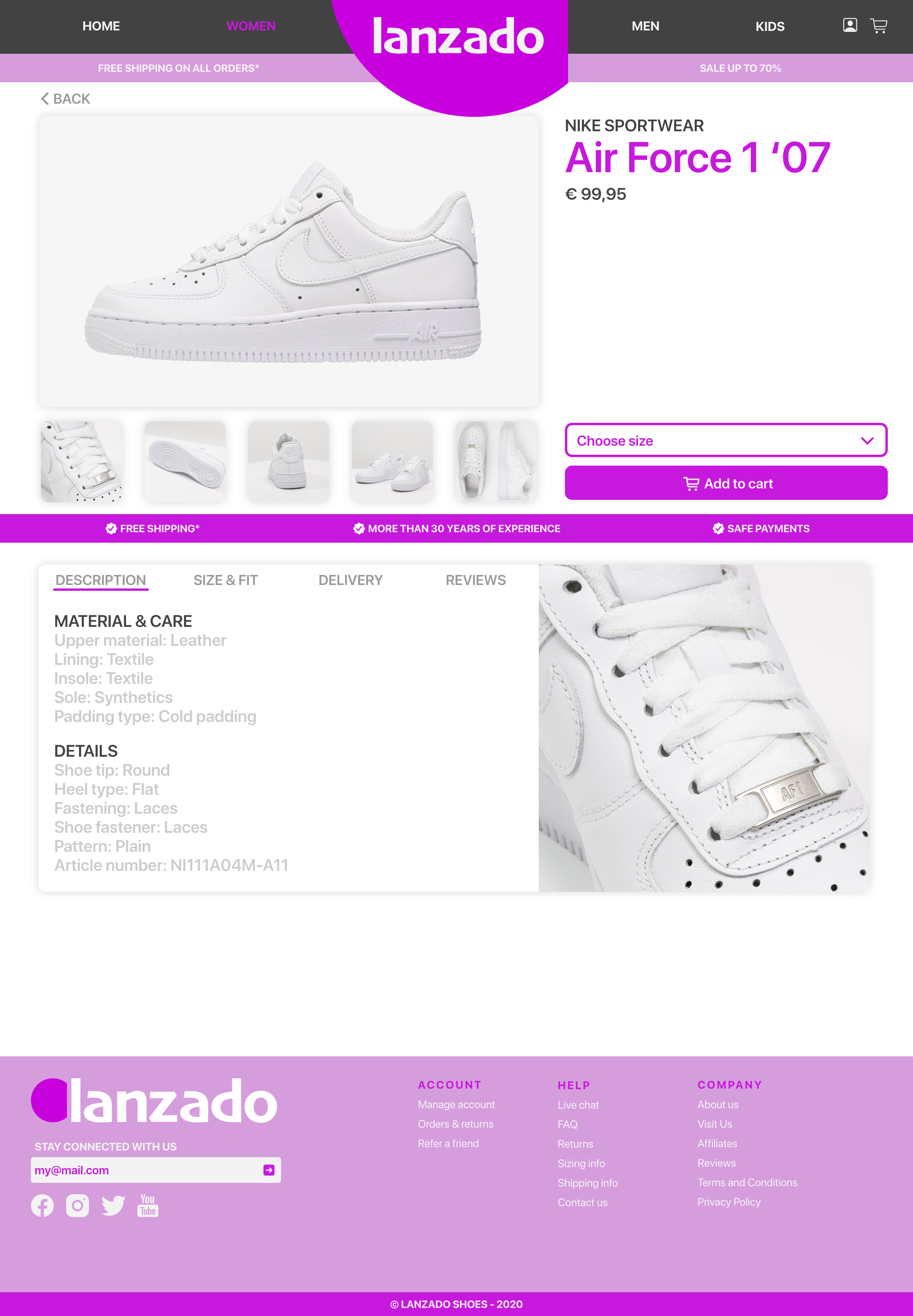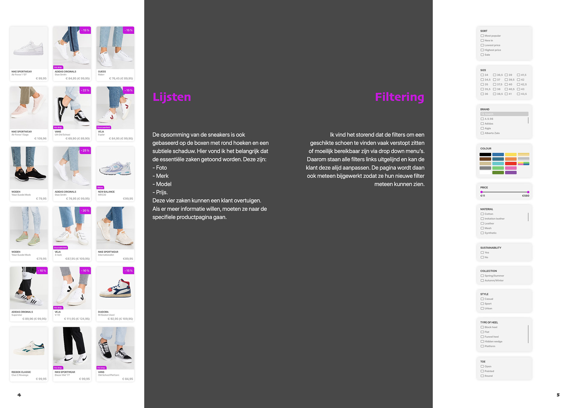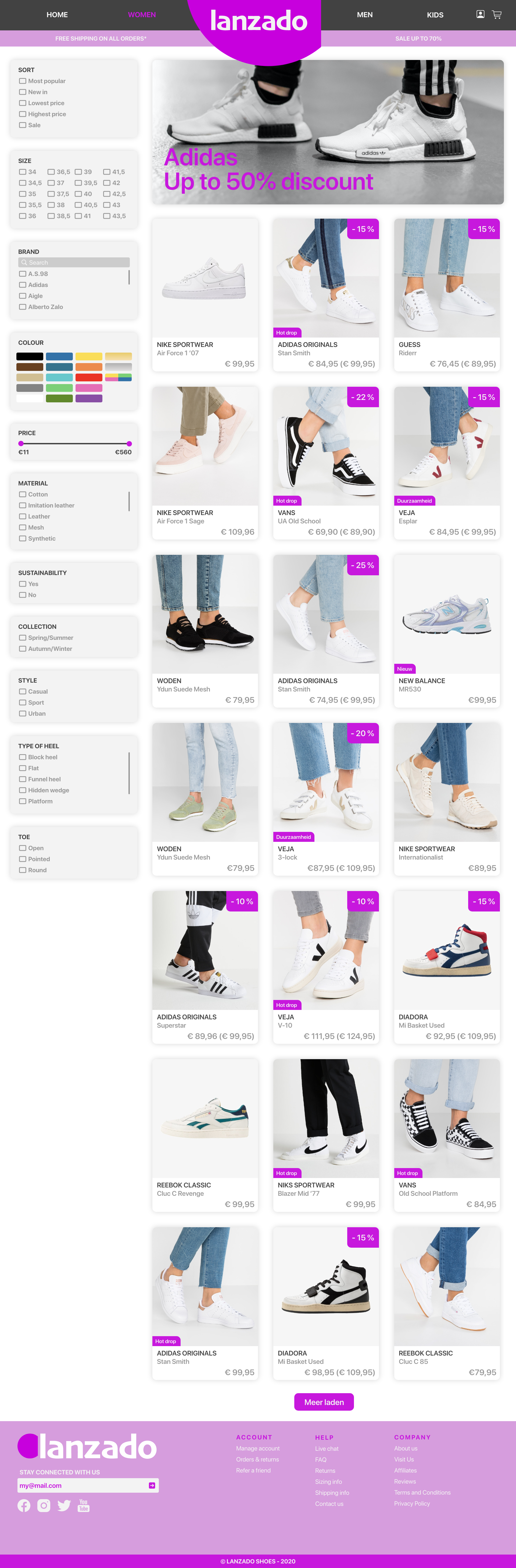 Maak Visual Designs voor een sneaker shop. Maak de Visual Designs op basis van de aangeleverde wireframes. Ontwerp enkel de desktopversie van beide schermen. Gebruik hiervoor Adobe XD.