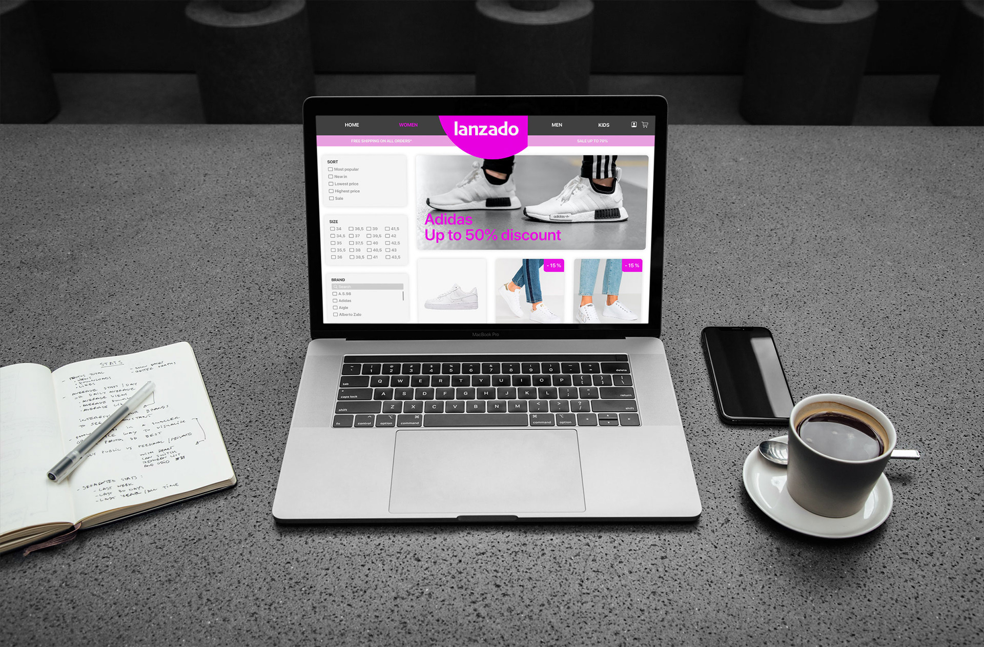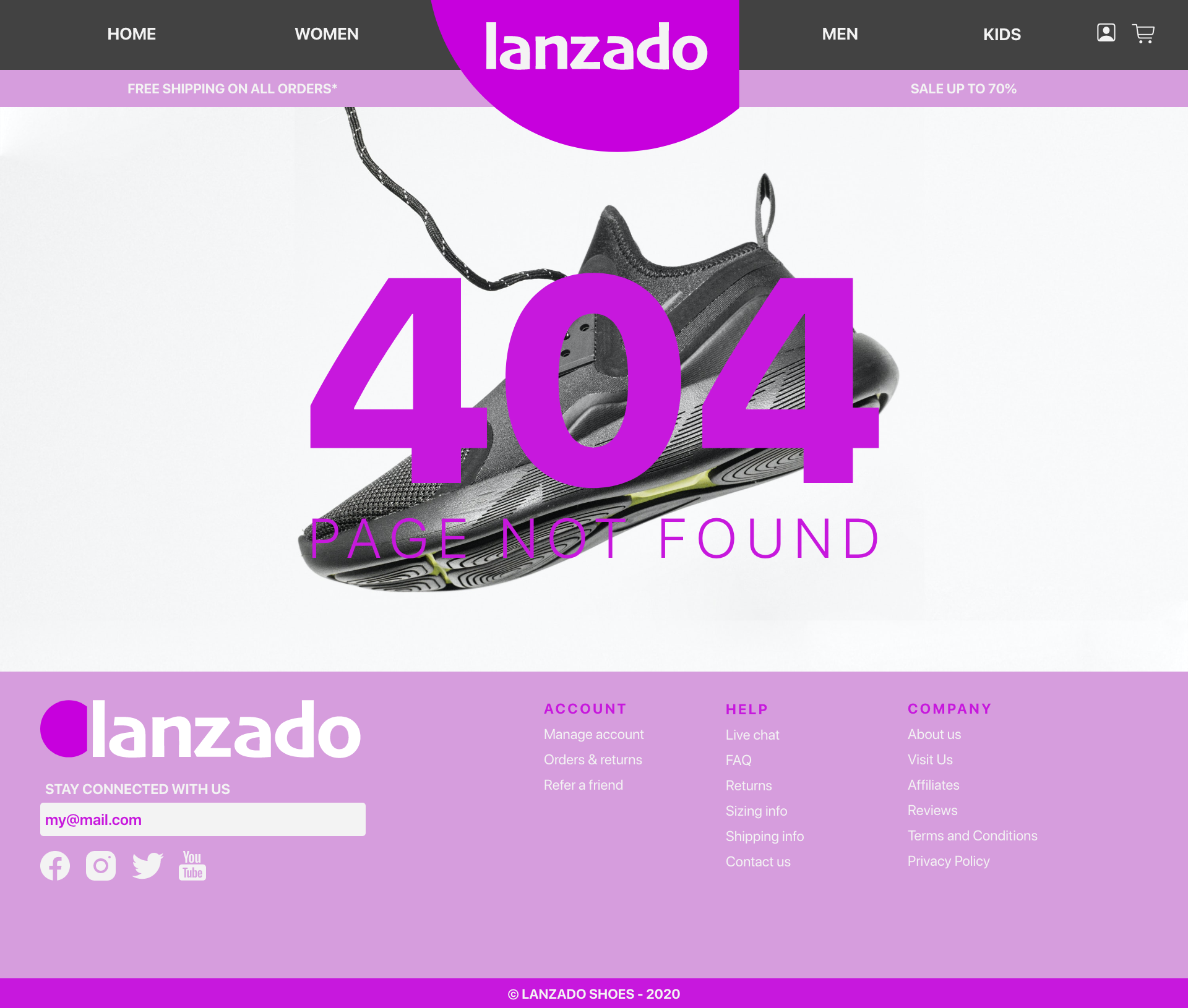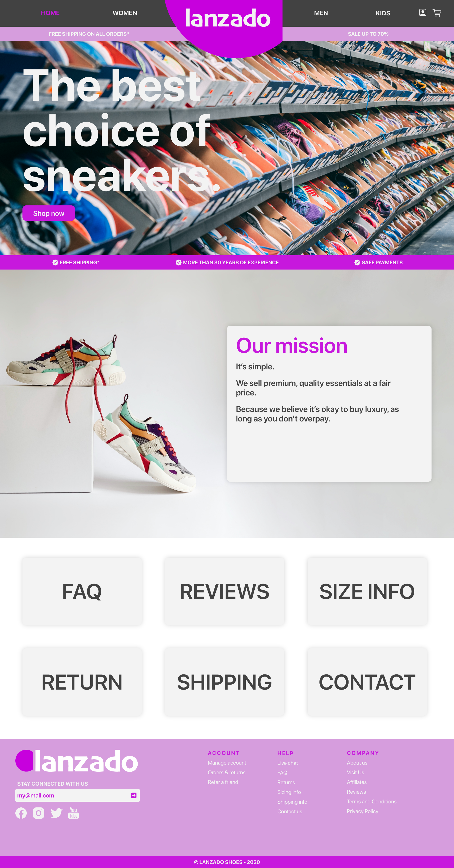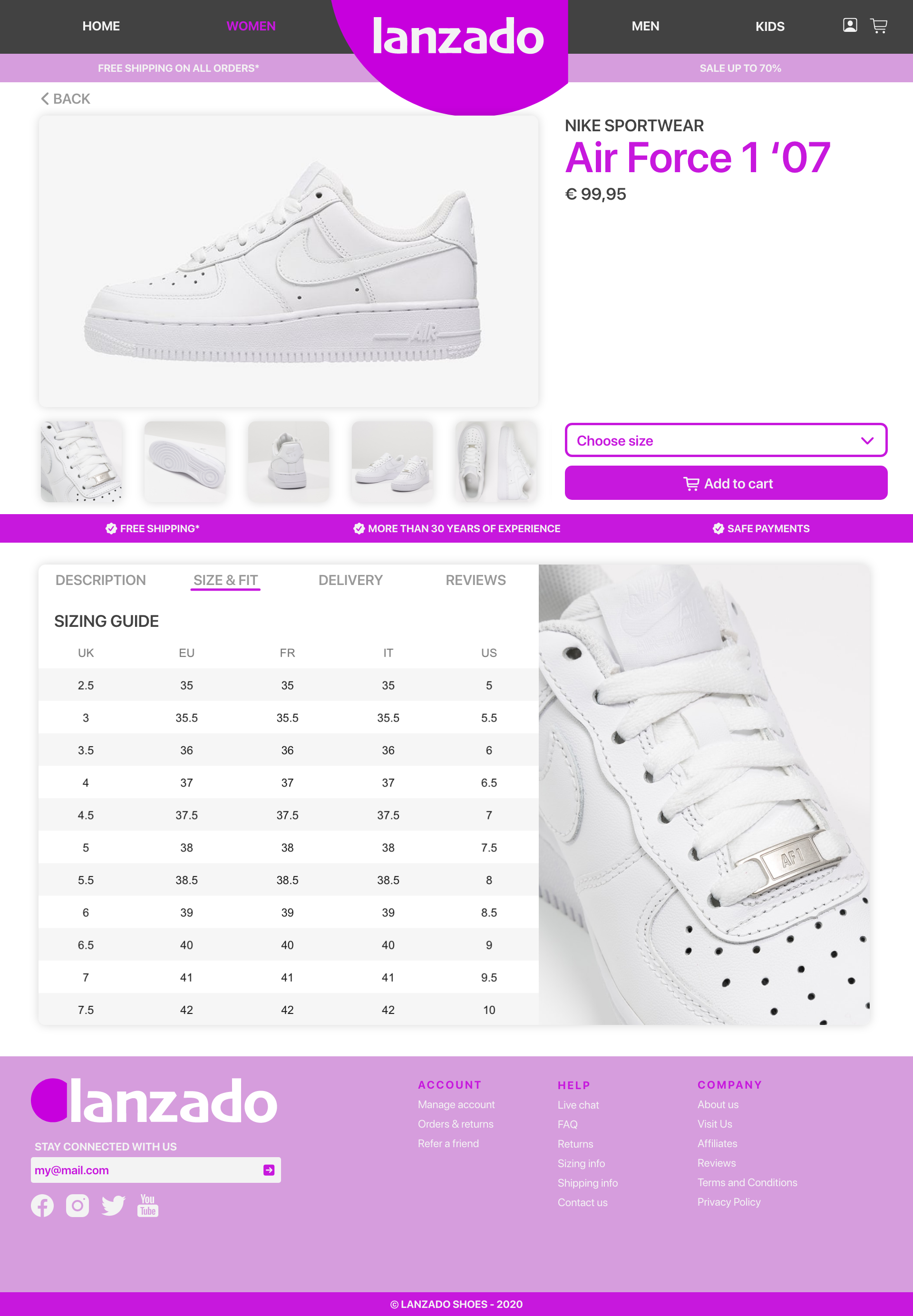 Maak Visual Designs voor een sneaker shop. Maak de Visual Designs op basis van de aangeleverde wireframes. Ontwerp enkel de desktopversie van beide schermen. Gebruik hiervoor Adobe XD.